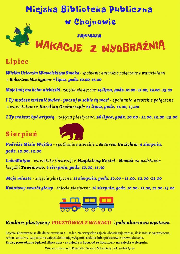 - Zapisów na zajęcia dokonują wyłącznie rodzice lub opiekunowie prawni dziecka. Zapisy na zajęcia, które odbędą się w sierpniu - spotkanie autorskie z Arturem Guzickim, warsztaty ilustracji z Magdaleną Kozieł-Nowak oraz zajęcia plastyczne „Moje miasto” i „Kolorowy zawrót głowy” - prowadzone będą od 26 lipca. Uwaga: zmiana terminu warsztatów ilustracji „LokoMotyw” z Magdaleną Kozieł-Nowak – odbędą się 9 sierpnia, godz. 10.00, 11.30 - informuje Miejska Biblioteka Publiczna.
