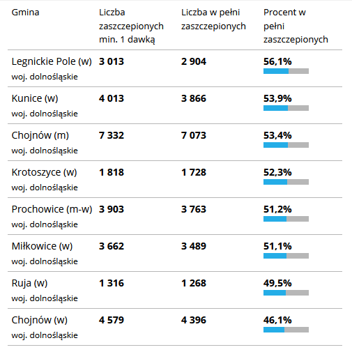 Tabelę naszego powiatu zamyka gmina wiejska Chojnów, gdzie liczba w pełni zaszczepionych mieszkańców wynosi 4 396 (46,1 proc.).