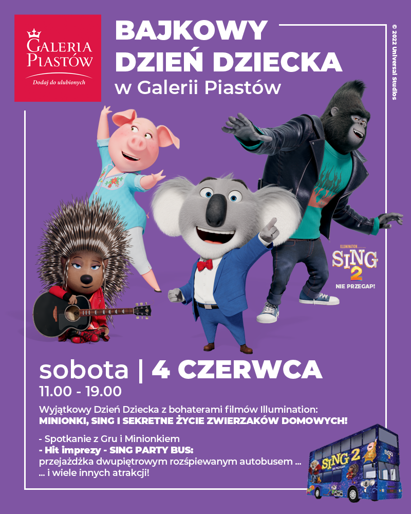 Zapraszamy zatem do Galerii Piastów na dzień pełen niesamowitej zabawy. Z naszej imprezy wrócicie do domu ze wspaniałymi nagrodami (m.in. zabawki od licencjodawców Minionków i filmowe gadżety i zabawki ze studia, a także bilety na film „Minionki: Wejście Gru”) i prezentami (Otto Pet Rock, najnowszy numer Magazynu FUN z plakatami, łamigłówkami i kolorowankami, naklejki i maski postaci z filmu Sing 2 oraz nadmuchane baloniki).