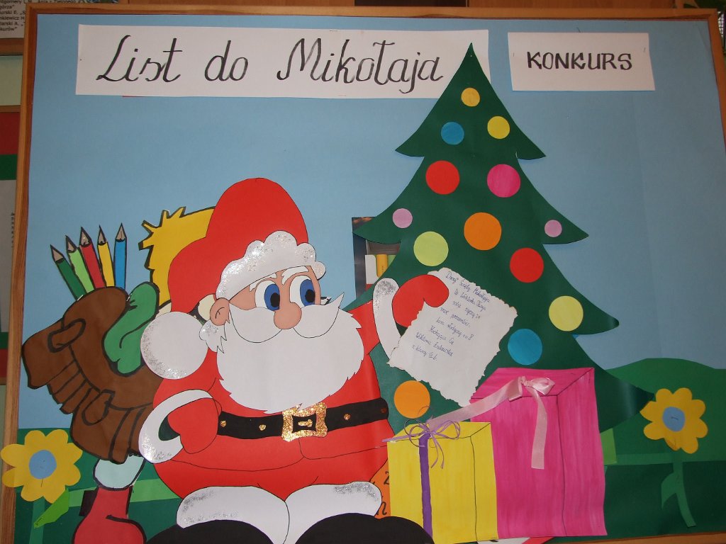 3 grudnia w świetlicy szkolnej odbył się konkurs „Listy do św. Mikołaja”. Był on przeznaczony dla uczniów klas IV-VI. Stanowił kontynuację konkursu z lat poprzednich (ubiegłych), lecz nadano mu nową formułę. Zadaniem uczniów było między innymi: poprawne zaadresowanie koperty, przestrzeganie formy listu jako wypowiedzi pisemnej (zwroty grzecznościowe, akapity, podpis), przestrzeganie zasad ortografii i interpunkcji, estetyczne wykonanie pracy.