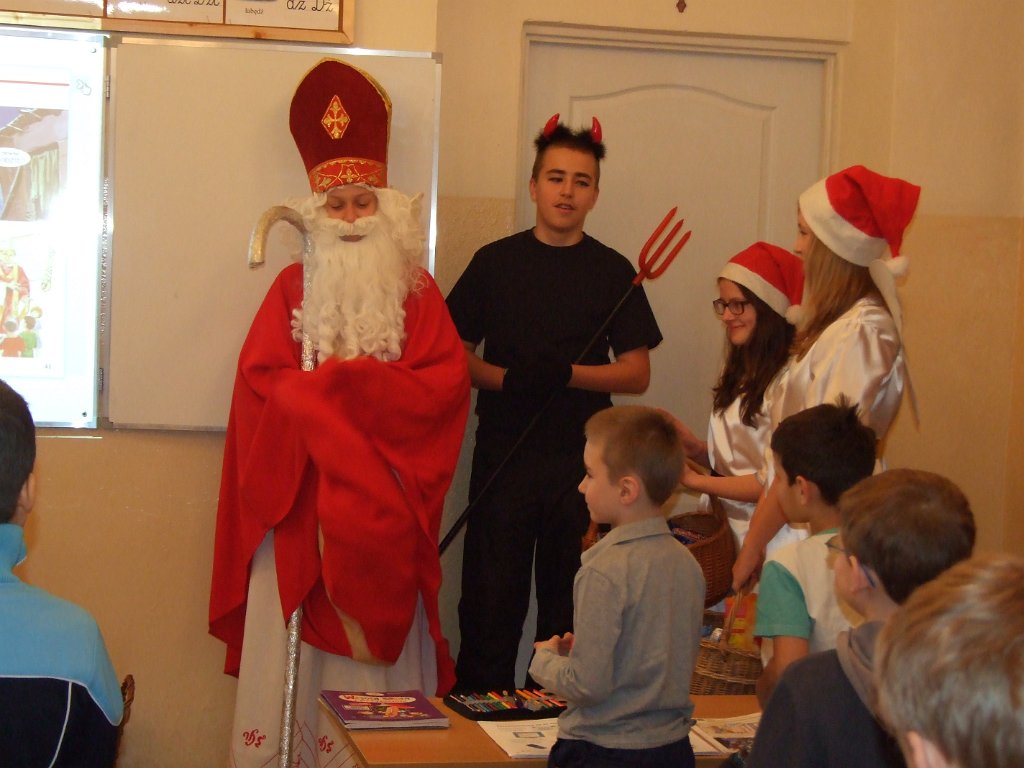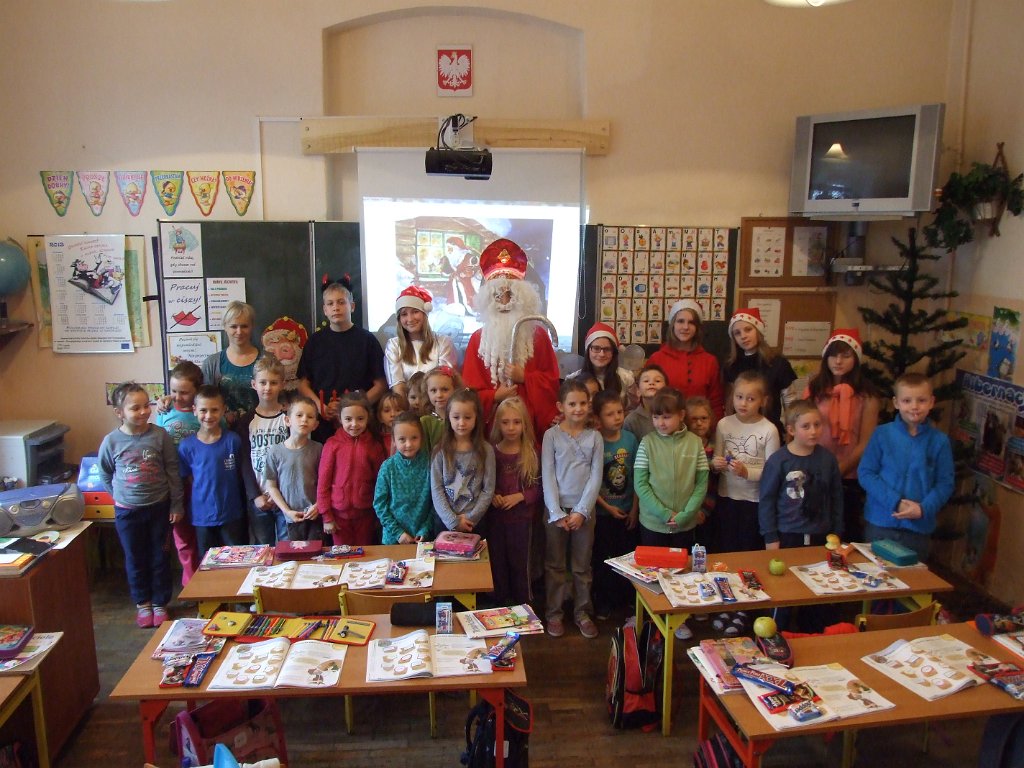 W piątek 6 grudnia do szkoły zawitał Mikołaj ze swoją świtą oraz co najważniejsze - z prezentami. Każdy uczeń otrzymał słodki upominek. Uczniowie popisywali się przed Mikołajem śpiewaniem piosenek i recytacją wierszy. Mikołaj nie zapomniał też o nauczycielach i pracownikach szkoły, którzy również dostali słodycze.