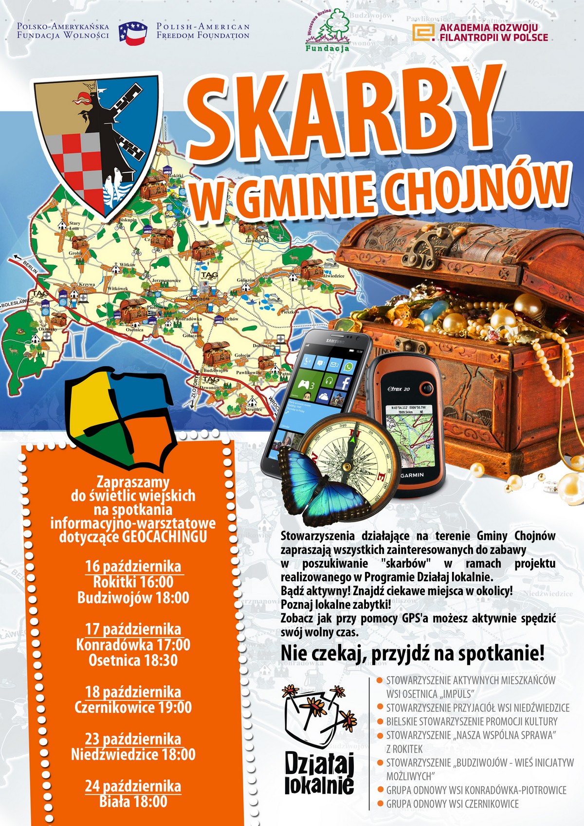 Stowarzyszenia i grupy odnowy wsi działające na terenie Gminy Chojnów zapraszają wszystkich zainteresowanych do zabawy w poszukiwanie "skarbów" w ramach projektu realizowanego w Programie Działaj lokalnie. Bądź aktywny! Znajdź ciekawe miejsca w okolicy. Poznaj lokalne zabytki, zobacz jak przy pomocy GPS'a możesz aktywnie spędzić swój wolny czas. Nie czekaj, przyjdź na spotkanie! Wybierz odpowiednie dla Ciebie miejsce i termin spotkania, czekamy na Ciebie!