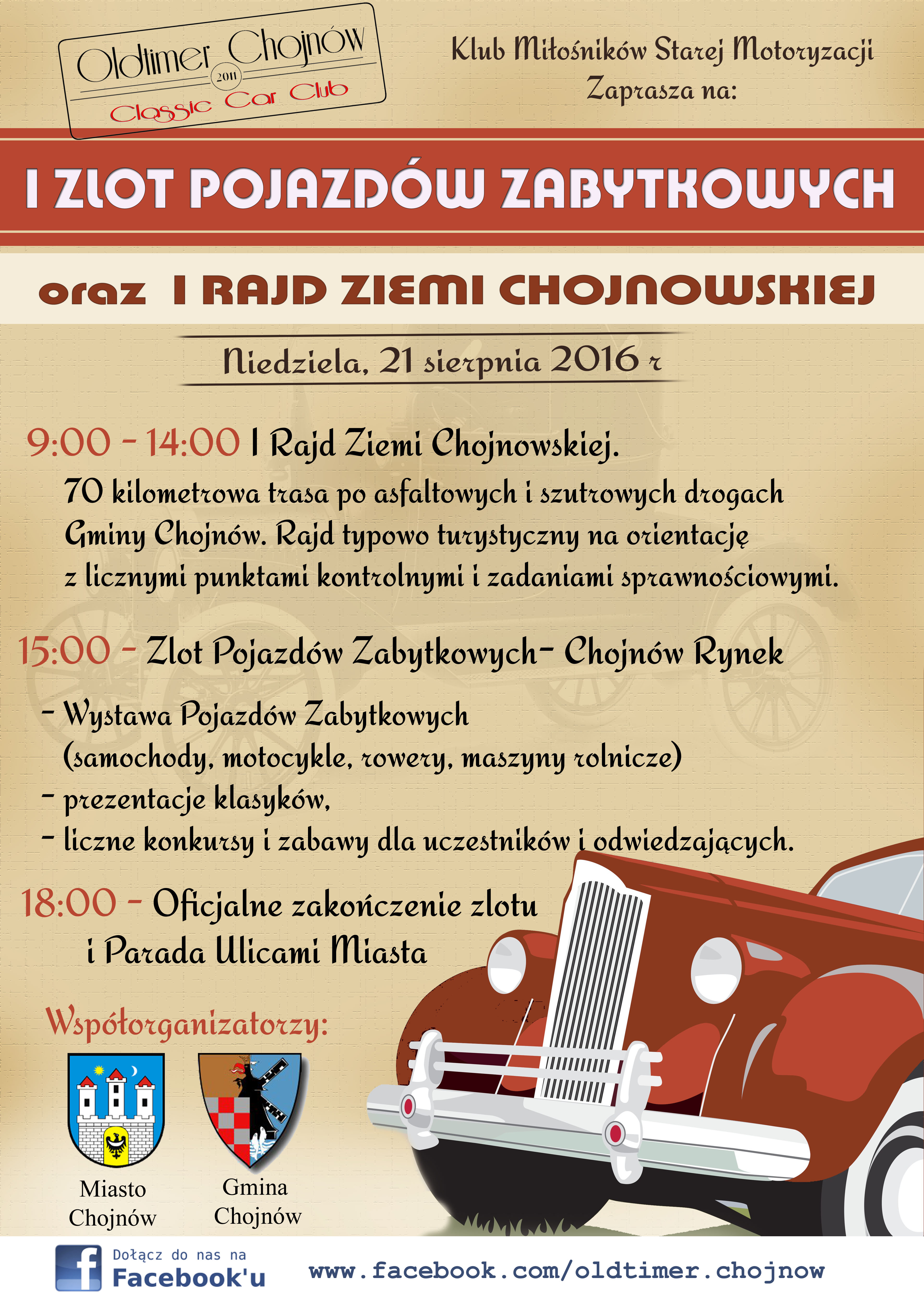 Po raz pierwszy w naszym mieście i gminie! Mowa rzecz jasna o Zlocie Pojazdów Zabytkowych oraz Rajdzie Ziemi Chojnowskiej - obie imprezy, organizowane przez Klub Miłośników Starej Motoryzacji "Oldtimer Chojnów" odbędą się 21 sierpnia, jednak już teraz osoby chcące wziąć udział mogą się zgłaszać.