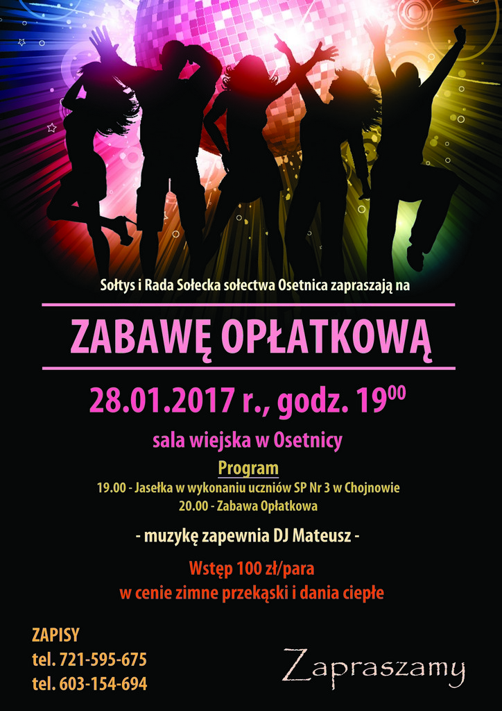 Wstęp na wydarzenie kosztuje 100 złotych od pary. Zapisy na zabawę opłatkową prowadzone są pod numerami: 721-595-675 oraz 603-154-694.